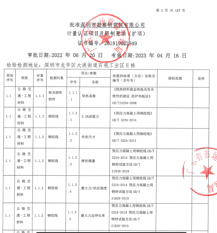 2022年6月20日,本会副会长单位深圳市勘察研究院有限公司(简称“深勘研院”)顺利通过建筑材料CMA扩项评审,新增1064个检测项目,覆盖了路基路面工程、安全防护用品、土工合成材料、外加剂、电线电缆、开关插座及电器附件、管材管件、灌浆材料、防水材料、门窗等14个产品类别,为更好地服务建筑市场奠定了坚实基础。