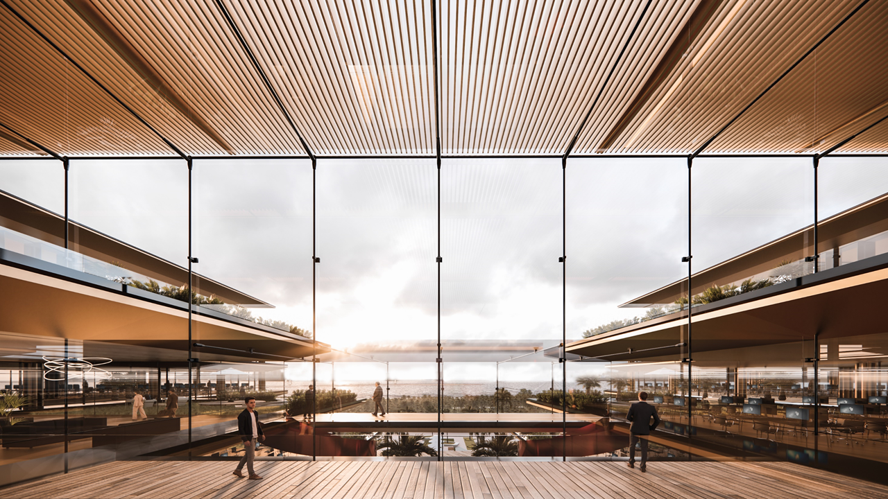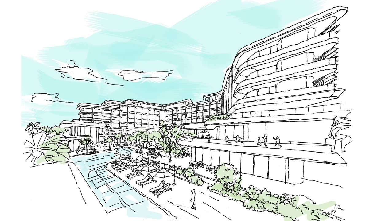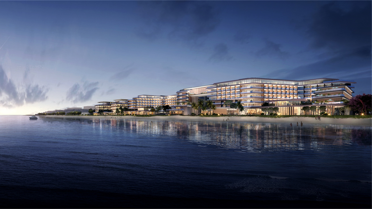 设计师提出“通城达海,享绿趣活”的理念,希望这座建筑不只是一座简单、封闭的滨海度假酒店,而是一处以酒店和会议展示为核心的、开放共享的服务型滨海商务街区。