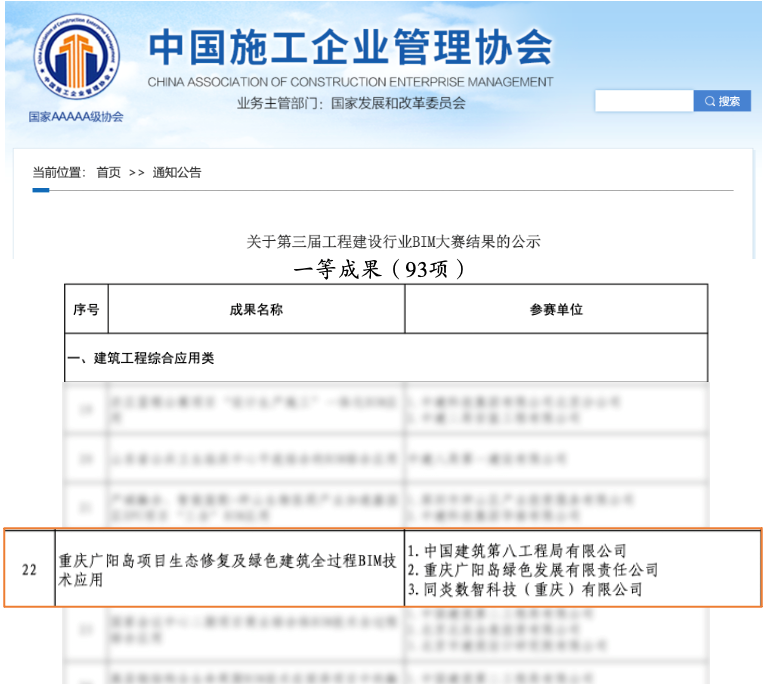 2022年7月8日,第三届工程建设行业BIM大赛结果公示,本会会员单位同炎数智科技(重庆)有限公司(简称“同炎数智”)及合作单位提交成果获建筑工程综合应用类一等成果奖。