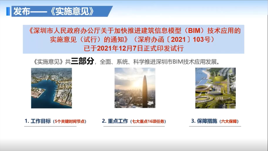 首先,由深圳市住房和建设局勘察设计与建设科技处邓文敏副处长作《关于加快推进建筑信息模型(BIM)技术应用的实施意见(试行)》宣贯,从发布背景、工作目标、重点任务和保障措施等四个维度展开解读,强调建设项目参建单位要积极响应该文件要求,充分发挥自身主观能动性,切实在实际项目中落实BIM技术应用。