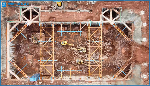 项目原始地貌为丘陵地质带,石方比例占有高,饱和单轴抗压强度≥15.15MPa,舞台基坑深度为江西省剧院深度最深。土方开挖、基坑支撑传统做法降效大,对剧院深基坑建造造成了困扰。