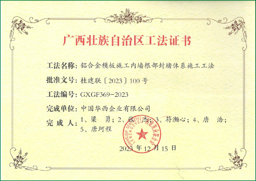 创新免开孔可调节关键技术、研究墙柱脚根部封堵等关键技术有效降低施工成本,保证施工质量,获实用新型专利5项、论文2篇、省市级工法多项,评价委员会认为该项成果达国内领先水平。