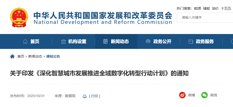 国家发展改革委等部门印发《深化智慧城市发展推进全域数字化转型行动计划》的通知